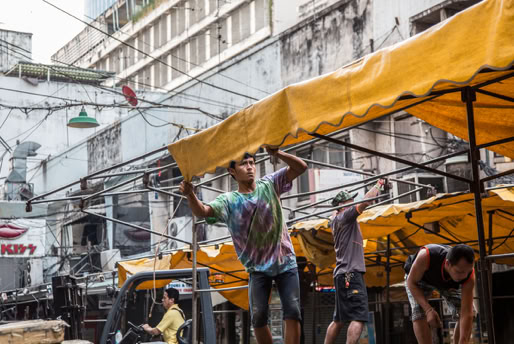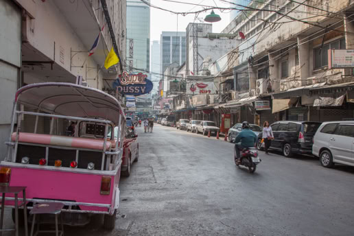 Jeden Tag um 3 Uhr nachmittags wird in Patpong die Straße gesperrt und der Nachtmarkt aufgebaut. Am anderen Morgen sieht die Straße wieder so aus, als sei nichts gewesen.
